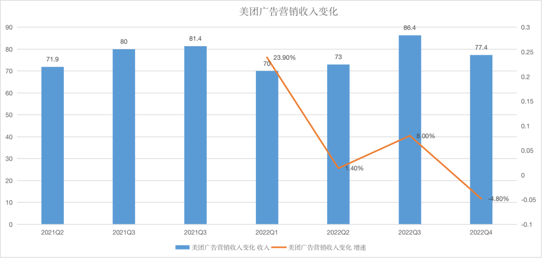 四季度,美團(tuán)的傭金收入146億,同比增長(zhǎng)13.7%,增速與訂單量增長(zhǎng)基本匹配。但廣告營(yíng)銷(xiāo)收入(主要來(lái)自到店、酒旅)表現(xiàn)相當(dāng)差,收入僅為77.4億元,同比下降4.8%,同樣是全國(guó)封城的去年Q2,美團(tuán)在此項(xiàng)的增速還有1.4%。