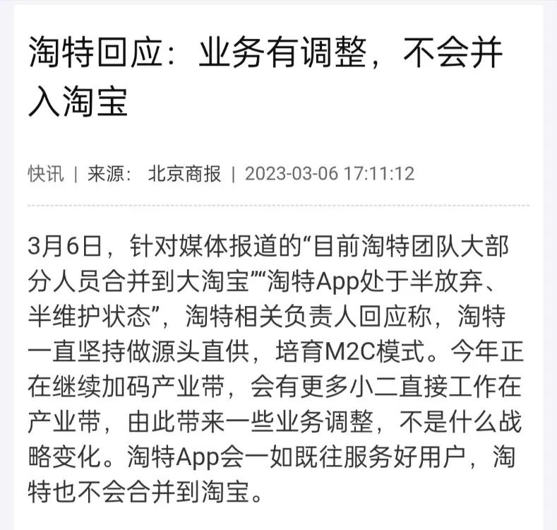 但好在,淘特馬上就進(jìn)行了辟謠。淘特相關(guān)負(fù)責(zé)人回應(yīng)稱,淘特今年正在繼續(xù)加碼產(chǎn)業(yè)帶,會(huì)有更多小二直接工作在產(chǎn)業(yè)帶,由此帶來一些業(yè)務(wù)調(diào)整,不是什么戰(zhàn)略變化。淘特App會(huì)一如既往服務(wù)好用戶,淘特也不會(huì)合并到淘寶。
