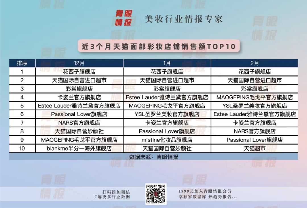 如在去年,花西子就宣布將在未來(lái)五年內(nèi)投入超過(guò)10億元,在產(chǎn)品創(chuàng)新、基礎(chǔ)研究與應(yīng)用基礎(chǔ)研究領(lǐng)域展開(kāi)布局,打造一個(gè)門類完善、技術(shù)先進(jìn)的東方美妝研發(fā)體系。而據(jù)青眼情報(bào)數(shù)據(jù),近三個(gè)月(2022年12月~2023年2月)天貓面部彩妝店鋪銷售額排行中,花西子已經(jīng)連續(xù)三月位列榜首。不難看出,持續(xù)夯實(shí)研發(fā)體系讓花西子走的越來(lái)越穩(wěn)健。