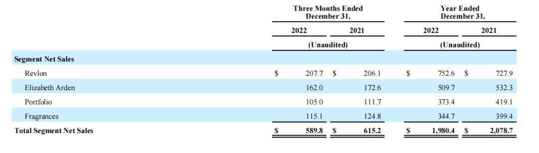 公開(kāi)資料顯示,目前露華濃公司旗下化妝品業(yè)務(wù)包括同名品牌露華濃、伊麗莎白雅頓、其他資產(chǎn)組合以及香水四大板塊。據(jù)最新財(cái)報(bào)顯示,這四大業(yè)務(wù)板塊在2022財(cái)年全年的凈銷售額依次為7.53億美元、5.1億美元、3.73億美元和3.45億美元(分別約合人民幣51.72億元、35億元、25.62億元和23.69億元)。這當(dāng)中,僅露華濃品牌的凈銷售額在全財(cái)年和第四季度均保持增長(zhǎng),增幅分別為3.4%和0.8%。而其它業(yè)務(wù)板塊,則均處于下滑狀態(tài)。
