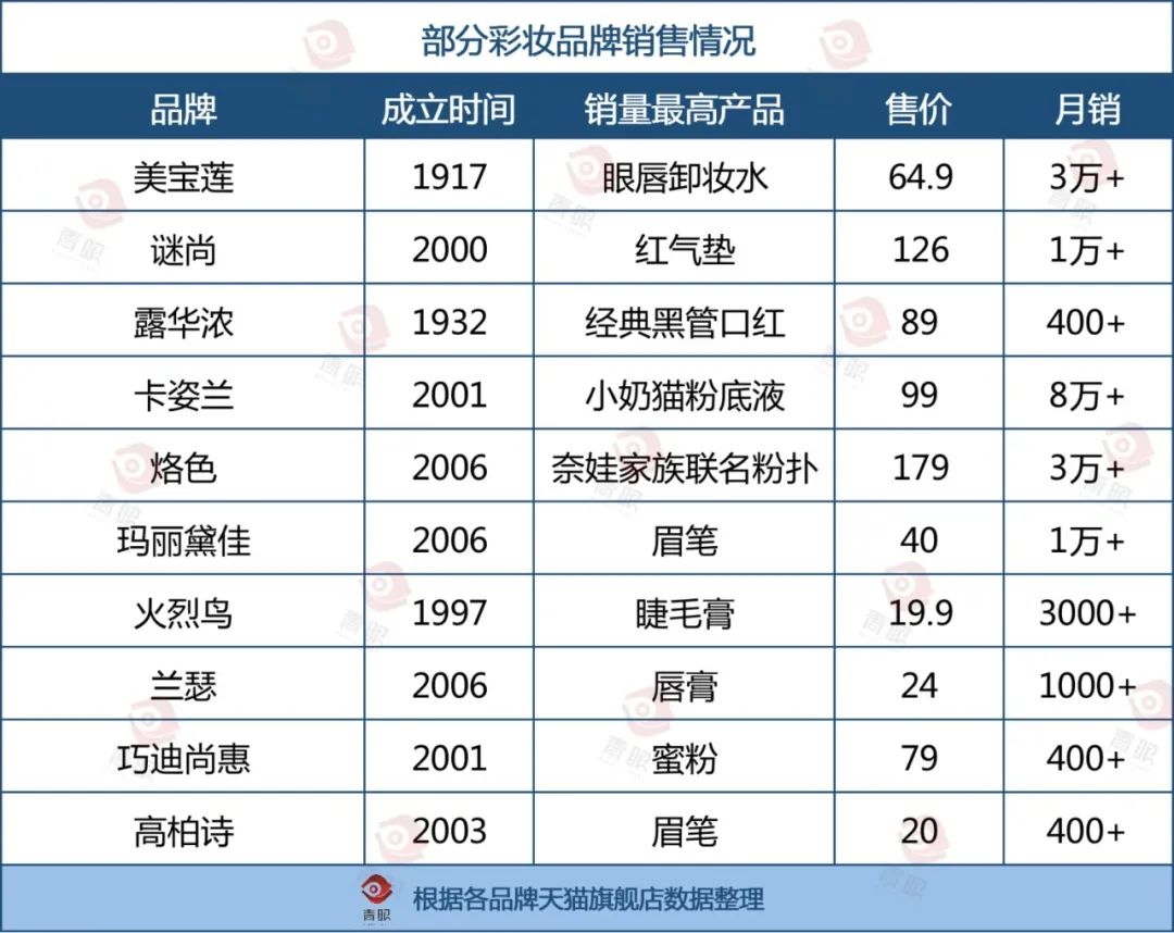 事實(shí)上,露華濃的沒(méi)落不過(guò)是初代彩妝品牌整體衰退的縮影。青眼梳理了部分具有代表性的早期彩妝品牌,發(fā)現(xiàn)在國(guó)貨彩妝中除了卡姿蘭和烙色仍能維持不錯(cuò)的銷量,其它諸多品牌早已風(fēng)光不再。從中也可以窺見(jiàn),代表時(shí)尚潮流的彩妝更迭之慘烈。