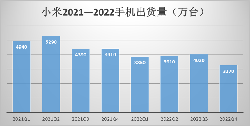 2022年Q4,小米全球智能手機出貨量3270萬臺,處在全年季度出貨量最低位。