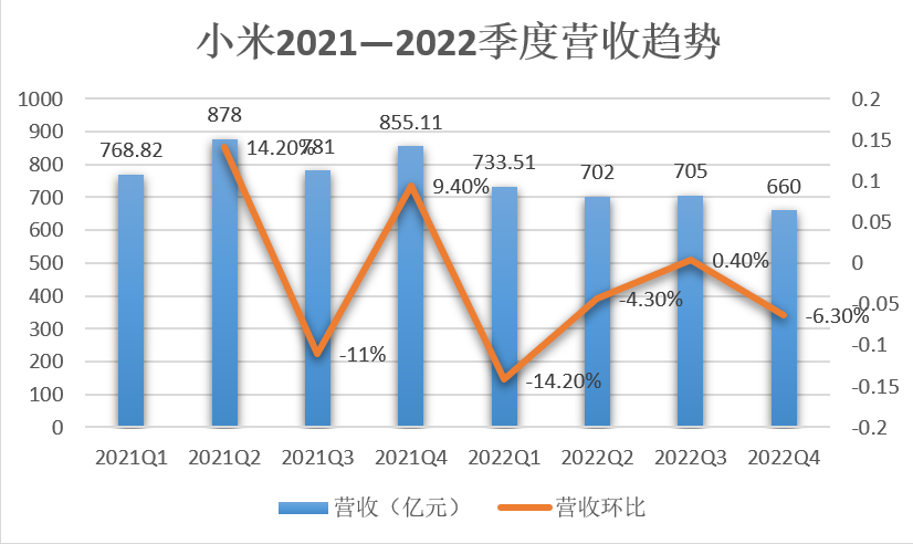 自從2018年上市以來,2022年第一季度是小米首次營收下滑,此次后,小米接連四個季度營收下滑,貫穿了一整年。