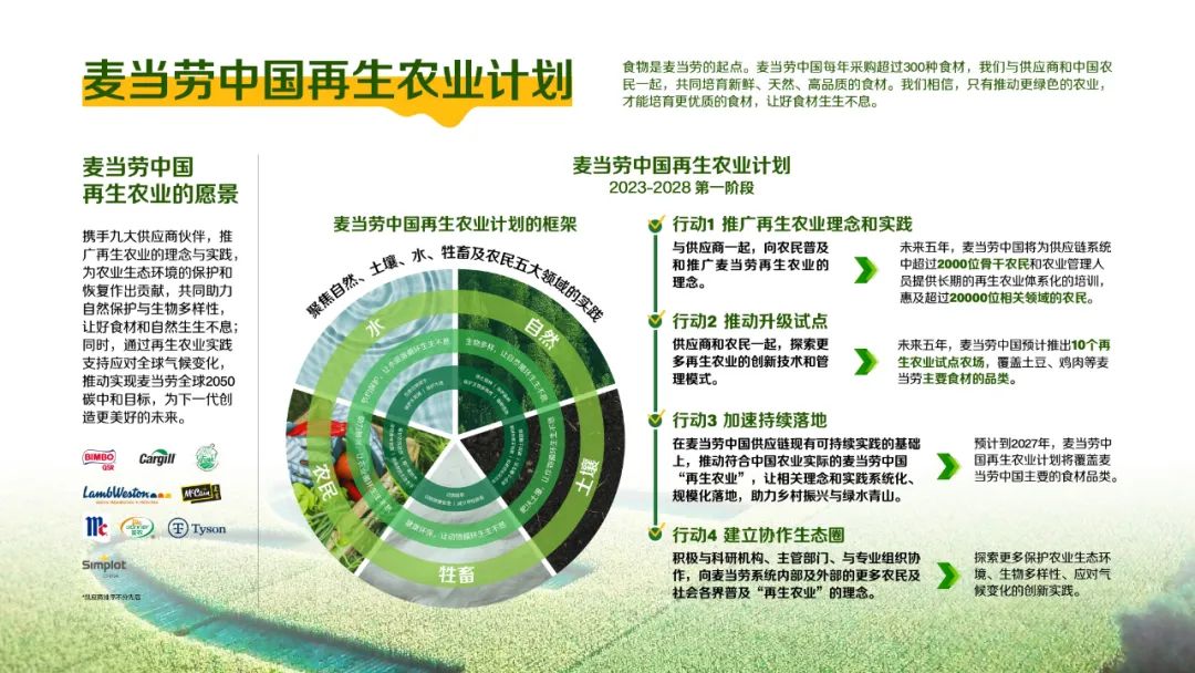 聚焦自然、土壤、水、牲畜及農(nóng)民五大領(lǐng)域的“麥當(dāng)勞中國(guó)再生農(nóng)業(yè)計(jì)劃”,將在2023-2028年的第一階段內(nèi)采取四大行動(dòng):