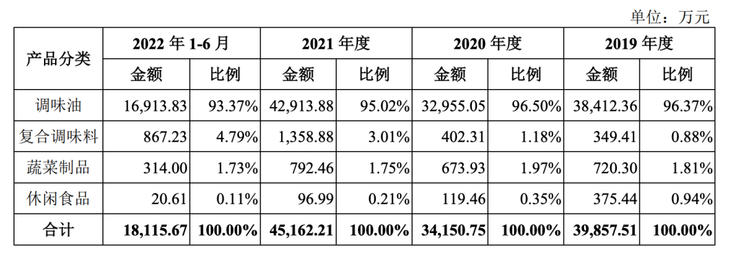 數(shù)據(jù)顯示,2019-2021年及2022年上半年,幺麻子的調(diào)味油收入分別為3.84億元、3.3億元、4.29億元和1.69億元,占比分別為96.37%、96.50%、95.02%和93.37%。報(bào)告期內(nèi),該公司來(lái)自主要產(chǎn)品藤椒油的收入占主營(yíng)業(yè)務(wù)收入的比例在80%以上。
