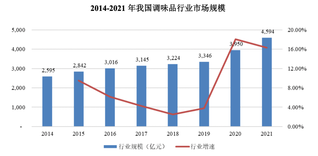 根據(jù)艾媒咨詢數(shù)據(jù)顯示,2014-2021年,我國(guó)調(diào)味品行業(yè)市場(chǎng)規(guī)模從2595億元增長(zhǎng)至4594億元,年均復(fù)合增長(zhǎng)率為8.5%。受疫情居家影響,2020年、2021年,我國(guó)調(diào)味品行業(yè)市場(chǎng)規(guī)模同比增長(zhǎng)18.05%、16.3%。