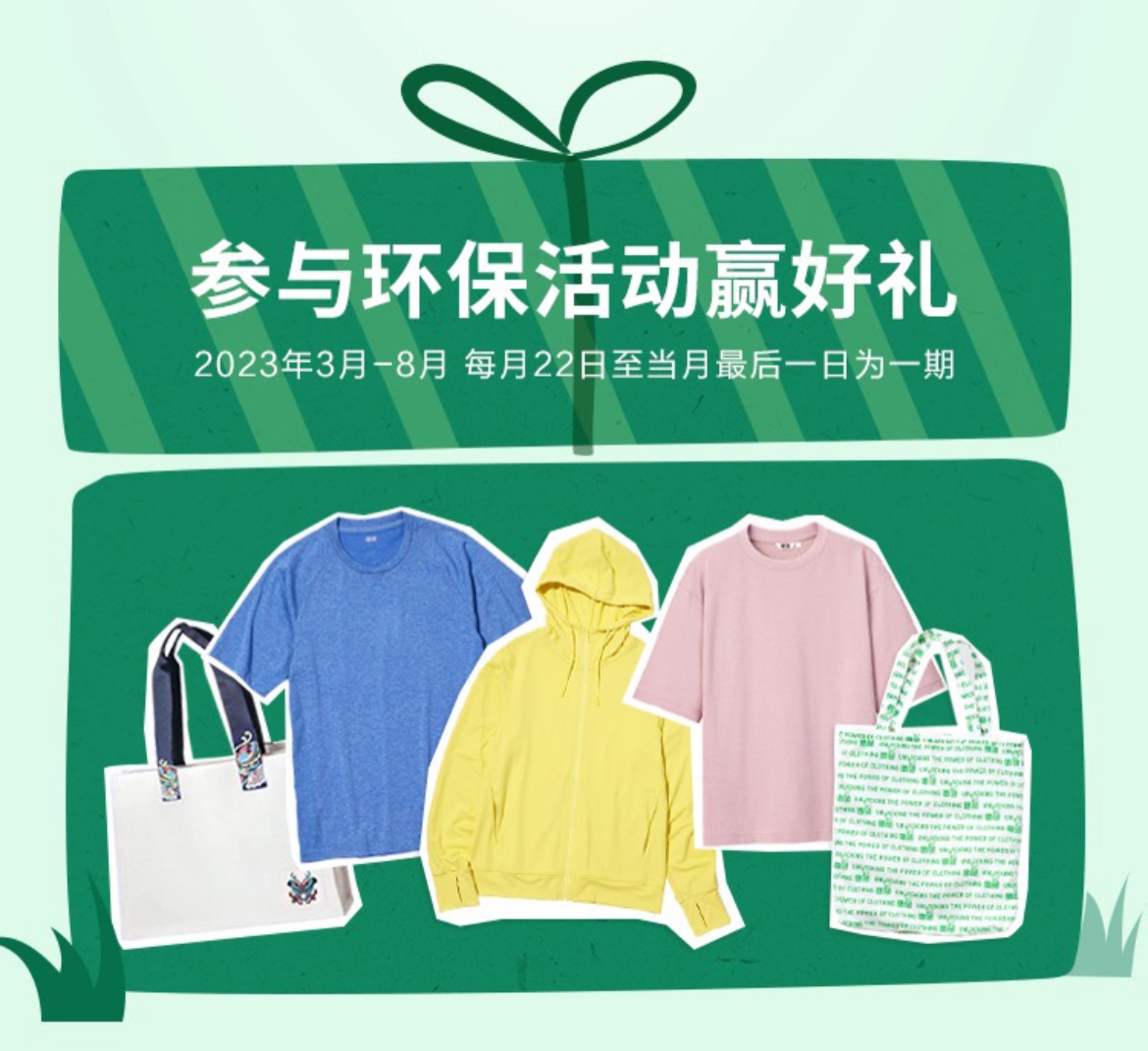 2023年3月至8月,優(yōu)衣庫發(fā)起“綠色低碳周”活動(dòng),每月22日至當(dāng)月最后一日為一期。消費(fèi)者可以參與以下任一可持續(xù)行動(dòng),拍照上傳微博或小紅書,帶上#愛時(shí)尚 愛地球#話題,贏驚喜好禮: