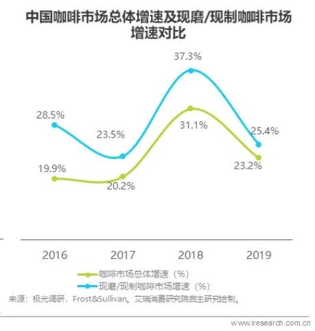瑞幸咖啡誕生的2018年,中國咖啡市場總體增速及現(xiàn)磨咖啡市場增速都處于較高水平。據(jù)艾瑞咨詢報告統(tǒng)計,彼時咖啡市場規(guī)模增速達到37.3%;而2019年時,市場增速就已急速放緩至25.4%的水平,顯然庫迪咖啡并沒有趕上瑞幸那波那么好的行情。