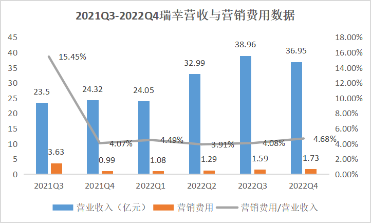 根據(jù)瑞幸咖啡的財報數(shù)據(jù),2019年度,瑞幸營銷費用為12.51億元人民幣,占比總營收30.25億元的41%。到2021年第三季度,這個占比已經(jīng)下降到15.45%,而到了2022年的四個季度,這個占比已經(jīng)下降到4%左右的水平。