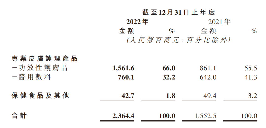 從品類來看,2022年,在巨子生物的專業(yè)皮膚護(hù)膚業(yè)務(wù)中,功效性護(hù)膚品的總收入為15.6億元,同比增長(zhǎng)81.3%,成為巨子生物業(yè)績(jī)?cè)鲩L(zhǎng)的最大動(dòng)力;醫(yī)用敷料總收入為7.6億元,同比增長(zhǎng)18.3%,占主營(yíng)業(yè)務(wù)比例為32.2%;保健食品及其他類型產(chǎn)品共計(jì)總收入為0.4億元,同比下降13.6%,占主營(yíng)業(yè)務(wù)比例為1.8%。