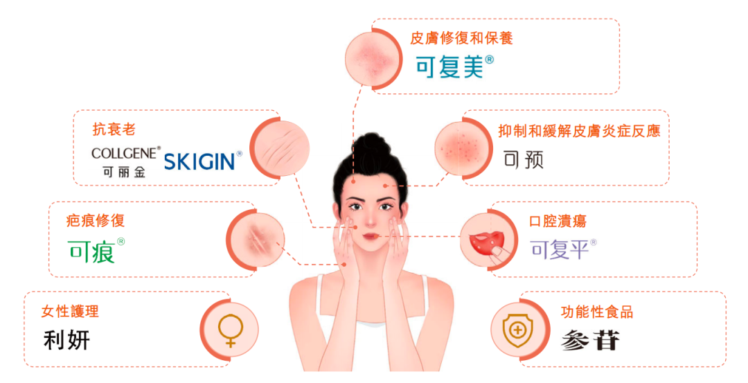 從品牌矩陣上看,巨子生物打造了可復(fù)美、可麗金、可預(yù)、可痕、可復(fù)平、利妍、欣苷(SKIGIN)及參苷八大品牌,共121項(xiàng)SKU,覆蓋醫(yī)療機(jī)構(gòu)、藥店、商超、電商等多個(gè)銷售渠道。目前巨子生物的產(chǎn)品類型包括功效性護(hù)膚品、醫(yī)用敷料和功能性食品等。