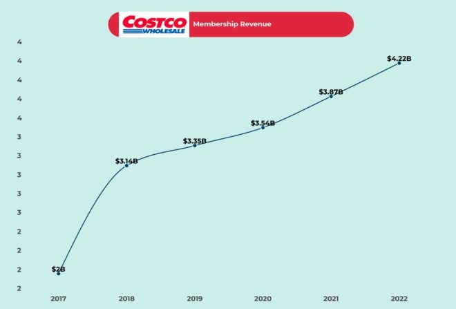 2017年至2022年,Costco全球會員費(fèi)收入(單位:十億美元)。圖源:fourweekmba