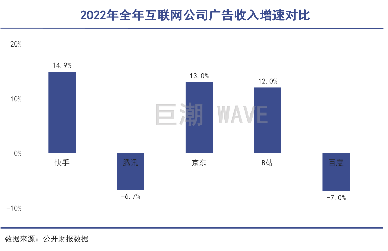 從全年數(shù)據(jù)來看,2022年快手的廣告收入增速達(dá)到14.9%,超越彭博市場一致預(yù)期的13.5%,不僅高于互聯(lián)網(wǎng)廣告行業(yè)平均,也高于騰訊、美團(tuán)、百度、網(wǎng)易、B站等互聯(lián)網(wǎng)公司。放到時間軸里橫向?qū)Ρ葋砜,四季?51億元的單季廣告收入也是歷史新高。