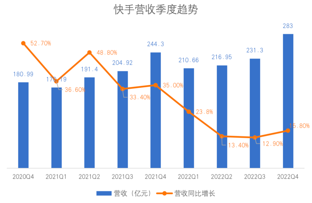 從全年來看,2022年快手總收入942億元,超越彭博市場一致預(yù)期的931億;同比增長16.2%,也超越彭博市場預(yù)期的14.8%。