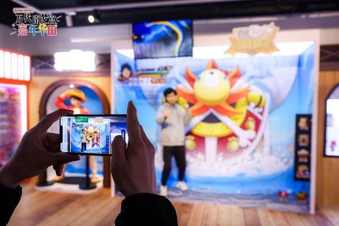 繼續(xù)前行,觀眾便進(jìn)入了各大知名IP的世界。在這里,除了觀看商品展示,來場者還可體驗(yàn)《航海王:燃燒意志》、《數(shù)碼寶貝:新世紀(jì)》,《火影忍者》手游AR,與游戲角色合影留念。