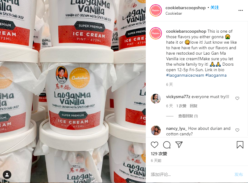 2020年,國外冰淇淋品牌Cookiebar Creamery推出老干媽香草味冰淇淋,并在菜單上如此描述:甜、咸、脆的完美平衡。