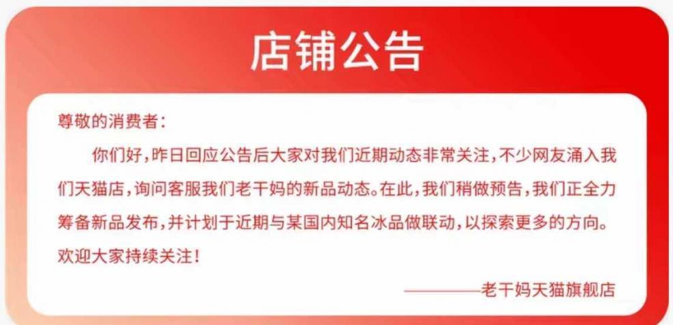 如今,消費者印象中再傳統(tǒng)不過的老干媽也想來湊熱鬧。3月17日,老干媽天貓官方旗艦店發(fā)布公告稱,老干媽內部正在全力籌備新品,并計劃在近期與國內某知名冰品企業(yè)聯(lián)動。