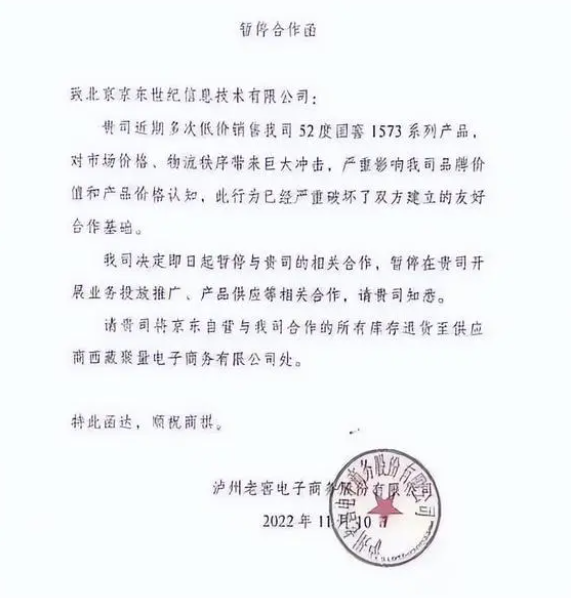 比如去年瀘州老窖旗下瀘州老窖電子商務(wù)有限公司對(duì)外發(fā)布和京東的暫停合作函,指責(zé)京東存在低價(jià)傾銷的行為。事實(shí)上,瀘州老窖電子商務(wù)有限公司的指責(zé)并非空穴來風(fēng)。瀘州老窖旗下大單品52度國窖的市場批發(fā)參考價(jià)在905元左右,單瓶廠商指導(dǎo)價(jià)為1499元。但在去年11月14日,瀘州老窖官方京東自營旗艦店該款白酒的預(yù)估到手價(jià)為1139元/瓶,疊加優(yōu)惠最低到手價(jià)為908元/瓶,這一價(jià)格直逼市場批發(fā)參考價(jià)。顯然擾亂了商家自有的定價(jià)體系。