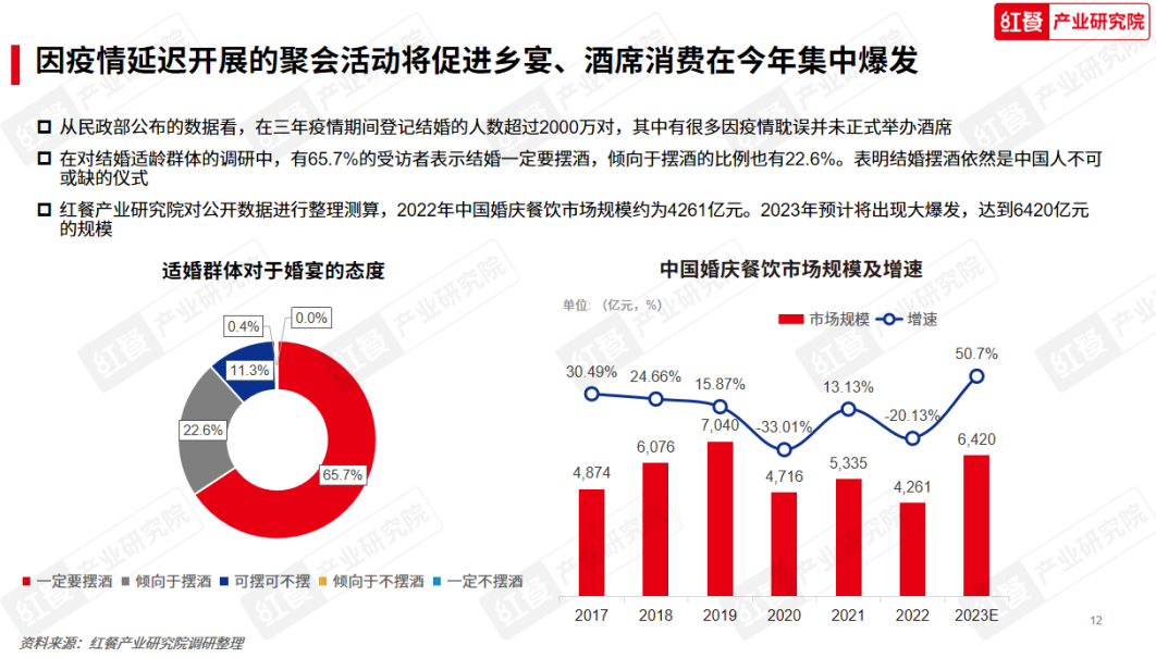 然而,結(jié)婚擺酒依然是中國人不可或缺的儀式。 在對結(jié)婚適齡群體的調(diào)研中,我們發(fā)現(xiàn)有65.7%的受訪者表示結(jié)婚一定要擺酒,傾向于擺酒的比例也達(dá)到了 22.6%;诖, 紅餐產(chǎn)業(yè)研究院對公開數(shù)據(jù)進(jìn)行整理測算, 2022年中國婚慶餐飲市場規(guī)模約為 4261億元,并預(yù)計(jì) 2023年將出現(xiàn)大爆發(fā),市場規(guī);?qū)⑦_(dá)到6420億元。