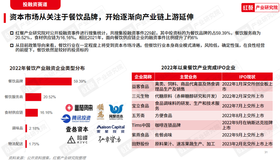 紅餐產(chǎn)業(yè)研究院統(tǒng)計(jì),2022年餐飲共有投融資事件229起,其中投資標(biāo)的為餐飲品牌的占59.39%,餐飲服務(wù)商為20.52%,食材供應(yīng)鏈為16.16%。