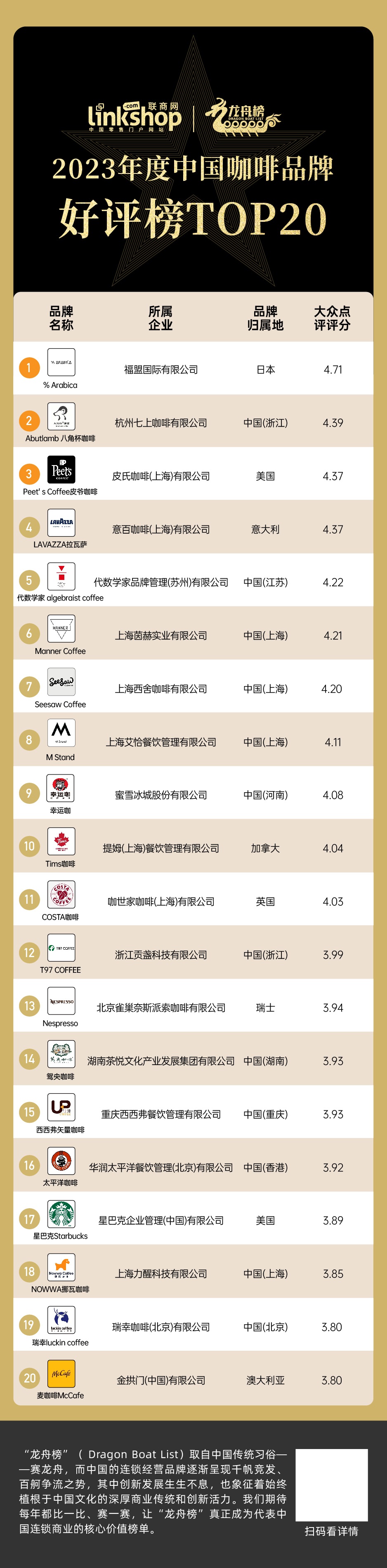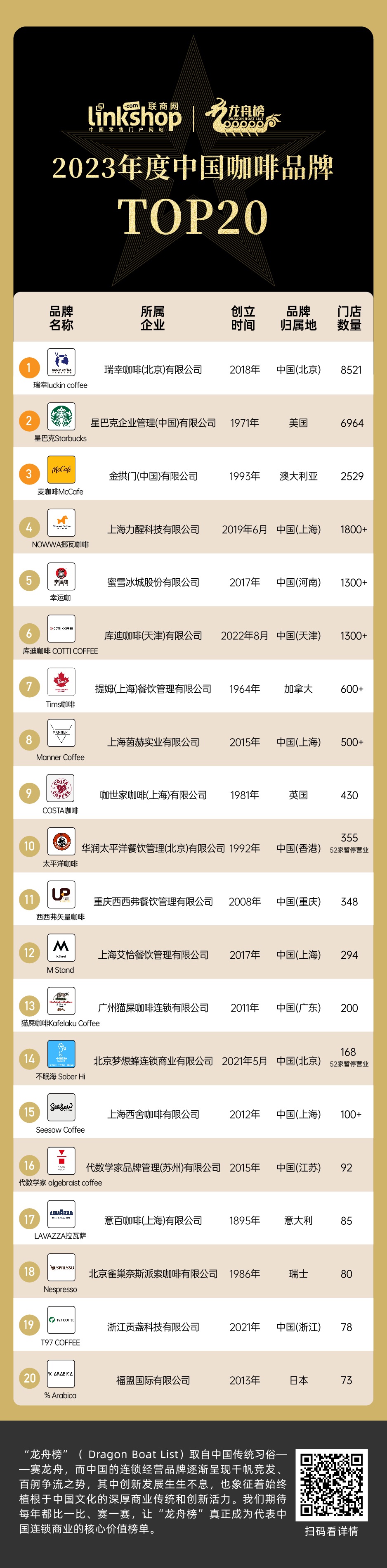 本期,《聯(lián)商網(wǎng)》評(píng)選出龍舟榜之“2023年度中國(guó)咖啡連鎖品牌TOP20”,以門(mén)店數(shù)量為標(biāo)準(zhǔn),輔以消費(fèi)者好評(píng)度、融資情況,以及新銳咖啡品牌,同時(shí)結(jié)合了多位行業(yè)人士的看法,以此探索咖啡賽道的發(fā)展趨向。