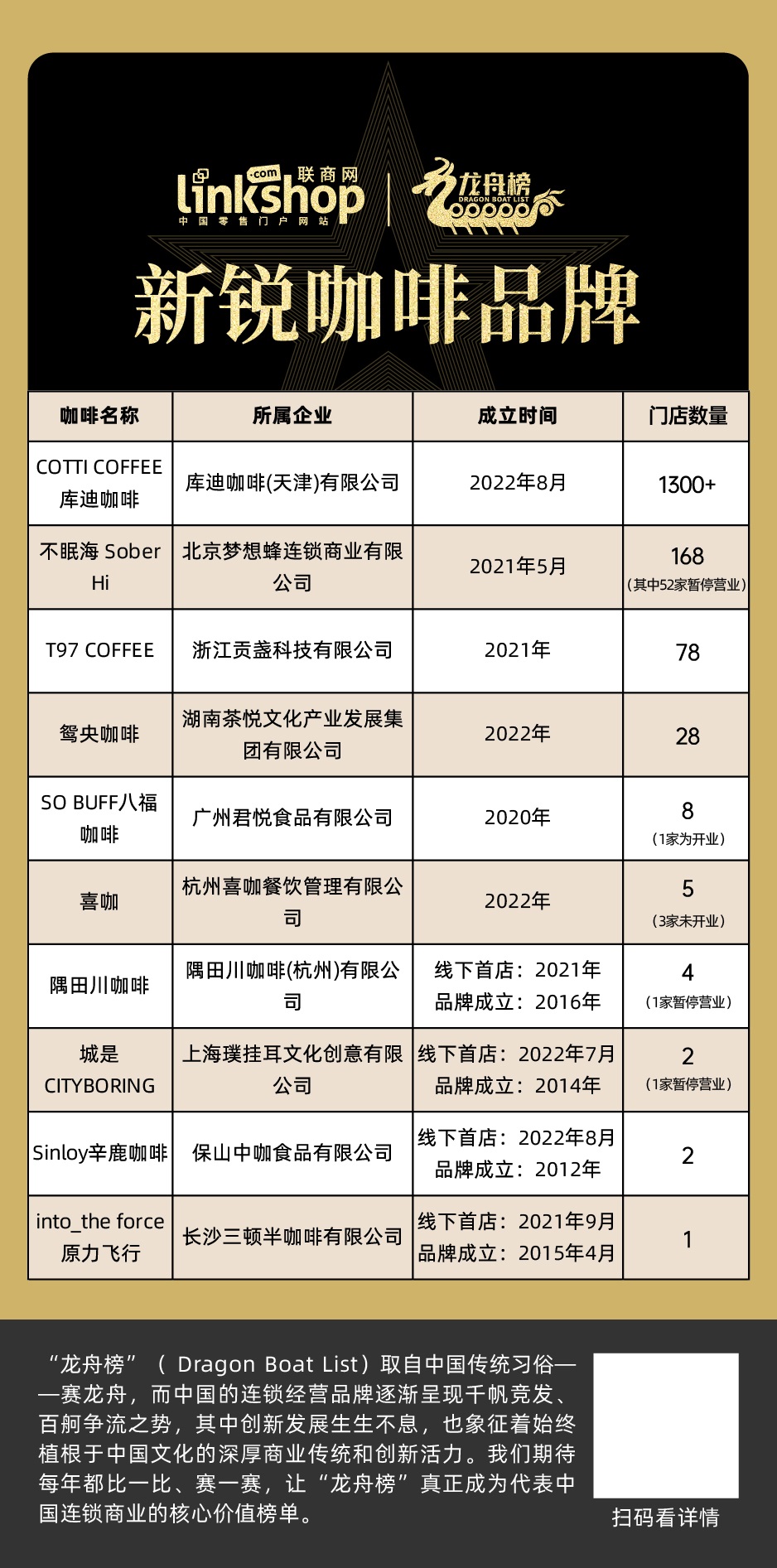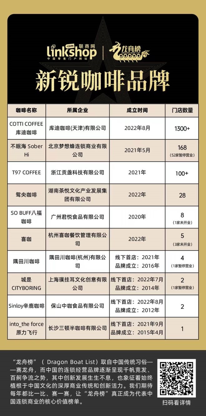 縱覽表格可以看到,近三年成立或發(fā)力的平價(jià)咖啡幸運(yùn)咖、新晉品牌T97 COFFEE、新中式咖啡鴛央咖啡等皆有上榜。