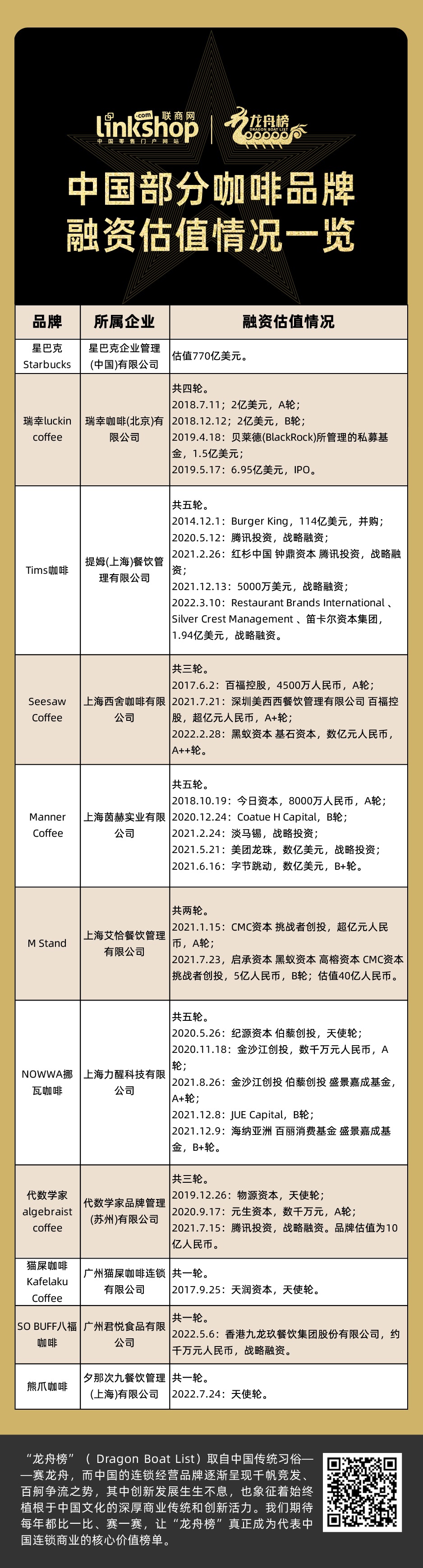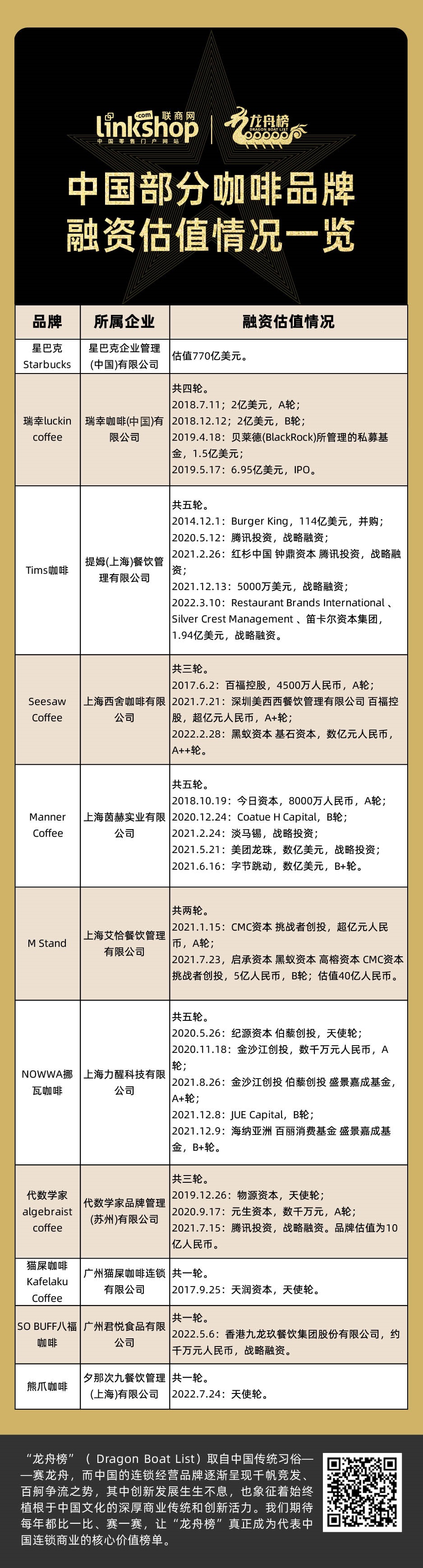 2022年,咖啡行業(yè)依舊是資本“寵兒”!堵(lián)商網(wǎng)》統(tǒng)計(jì)了部分咖啡品牌的融資估值情況。