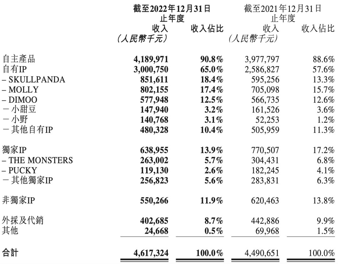 2022年,泡泡瑪特自有IP收入占比達(dá)65%,依舊是公司最核心的收入來(lái)源,主要依靠SKULLPANDA貢獻(xiàn)18%的收入。