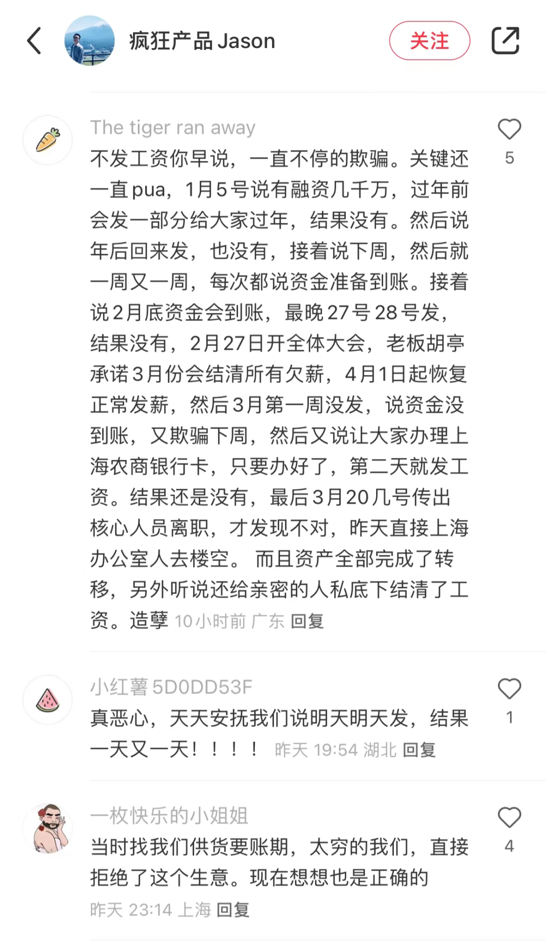 3月30日,一位個人簡介顯示為“前字節(jié)攜程產(chǎn)品總監(jiān),現(xiàn)任虎頭局維權討薪人”的網(wǎng)友,在小紅書上發(fā)布了一篇標題為“虎頭局倒閉之親身經(jīng)歷(一):融資3億的網(wǎng)紅品牌欠款2億,虎頭局倒閉了”的文章。