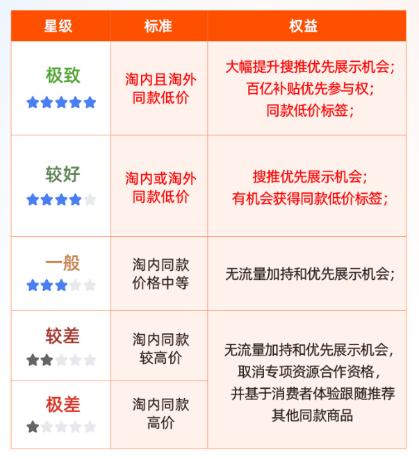 其中,五星級(jí)對(duì)應(yīng)“全網(wǎng)低價(jià)”,商品不僅會(huì)獲得搜索推薦優(yōu)先展示,還有機(jī)會(huì)被展示在商品搜索結(jié)果第一屏,并獲得全網(wǎng)低價(jià)標(biāo)簽認(rèn)證。四星級(jí)對(duì)應(yīng)“同款低價(jià)”(淘內(nèi)或淘外低價(jià)),商品會(huì)獲得搜索優(yōu)先展示的機(jī)會(huì),也有機(jī)會(huì)獲得同款低價(jià)標(biāo)簽認(rèn)證。三星及三星以下的商品,淘寶不會(huì)給予流量支持。