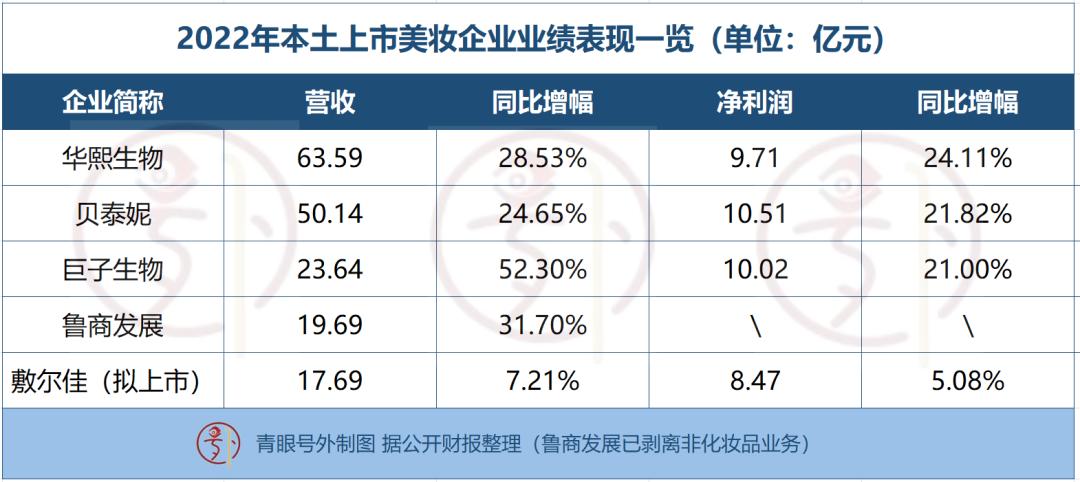與此同時(shí),一眾上市美妝企業(yè)格局也發(fā)生了不小的變化。譬如,華熙生物、貝泰妮昂首挺進(jìn)“50億”俱樂部,巨子生物、魯商發(fā)展、敷爾佳則均創(chuàng)得業(yè)績新高。另在品牌端,有多個(gè)成立時(shí)間較短的國貨美妝品牌在不確定的大環(huán)境下逆勢增長,全年銷售額突破10億大關(guān),一舉沖向20億美妝陣營。
