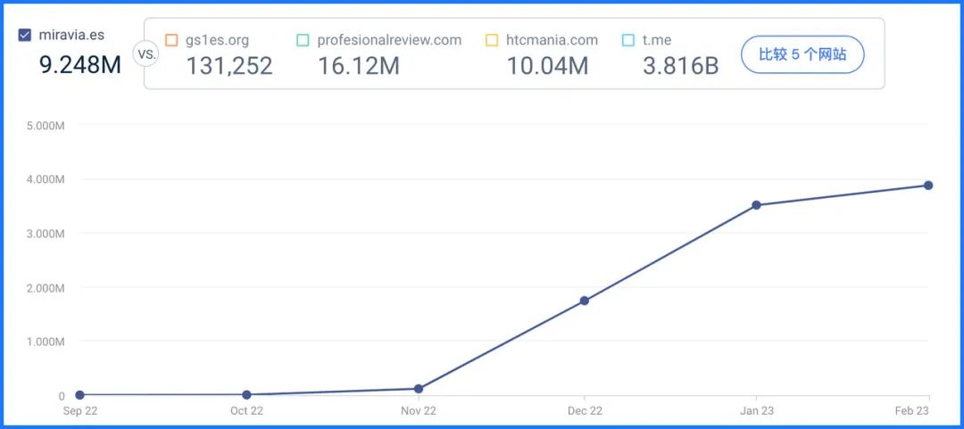根據(jù)網(wǎng)站數(shù)據(jù)分析平臺Similarweb的數(shù)據(jù)顯示,從自去年12月到今年2月底,Miravia.es網(wǎng)站(電腦和移動端網(wǎng)頁)的總訪問量超過900萬。