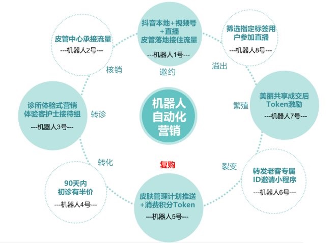 從商業(yè)模型來看,秋濤美膚的最大流量來源是抖音、視頻號(hào)、美團(tuán)等公域流量平臺(tái),通過投放生活美容系列內(nèi)容,以較低的流量成本觸達(dá)潛在用戶,將用戶引流至秋濤皮膚管理中心體驗(yàn)清潔、補(bǔ)水等基礎(chǔ)皮膚護(hù)理,這一環(huán)節(jié)的用戶會(huì)收到秋濤診所的免費(fèi)體驗(yàn)禮包并轉(zhuǎn)化為秋濤輕醫(yī)美診所的私域流量,以輕銷售的形態(tài)完成了第一次流量轉(zhuǎn)化。據(jù)介紹,自皮膚管理中心導(dǎo)入輕醫(yī)美診所的流量占比約40%。隨后的診所體驗(yàn)、初診環(huán)節(jié),銷售機(jī)器人會(huì)推送定制內(nèi)容跟進(jìn)用戶皮膚管理進(jìn)展,促進(jìn)復(fù)購。用戶完成初診后,銷售機(jī)器人會(huì)向客戶推送專屬邀新小程序,通過“以老帶新”的激勵(lì)機(jī)制來促進(jìn)新人會(huì)員的吸納與激活。