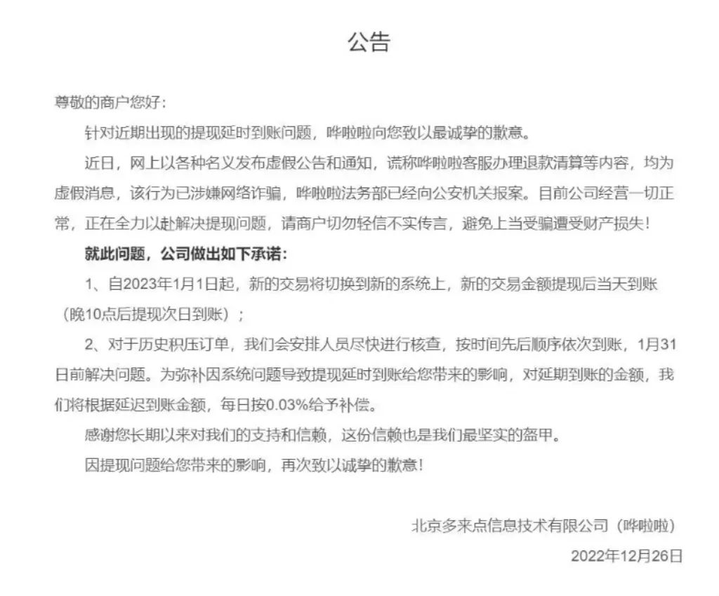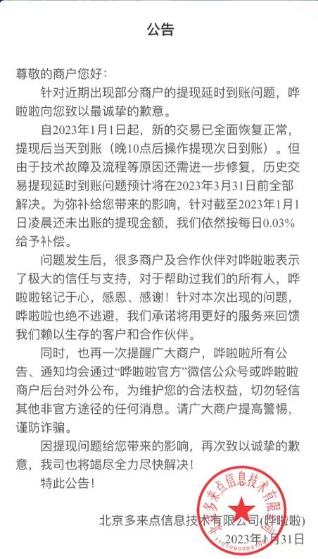 而在新的公告里,嘩啦啦又將提現(xiàn)延遲的理由歸結(jié)為“由于技術(shù)故障及流程等原因還需進(jìn)一步修復(fù) ”。并且再一次作出承諾,稱(chēng)“歷史交易提現(xiàn)延時(shí)到賬問(wèn)題預(yù)計(jì)將在2023年3月31日前全部解決。”