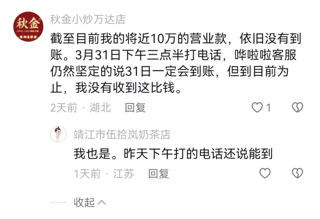 萬(wàn)達(dá)一名經(jīng)營(yíng)小炒店的老板反映道:“截至目前我的將近10萬(wàn)的營(yíng)業(yè)款,依舊沒(méi)有到賬。3月31日下午三點(diǎn)半打電話(huà),嘩啦啦客服仍然堅(jiān)定地說(shuō)31日一定會(huì)到賬,但到目前為止,我沒(méi)有收到這筆錢(qián)!