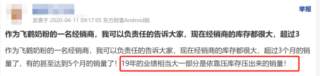壓貨給經(jīng)銷商并不是空穴來風,之前就有經(jīng)銷商在投資者交流平臺上留言稱,飛鶴給經(jīng)銷商壓貨3到5個月的銷售量,而2019年的業(yè)績,相當大一部分是依靠經(jīng)銷商壓貨,壓出來的銷售量。