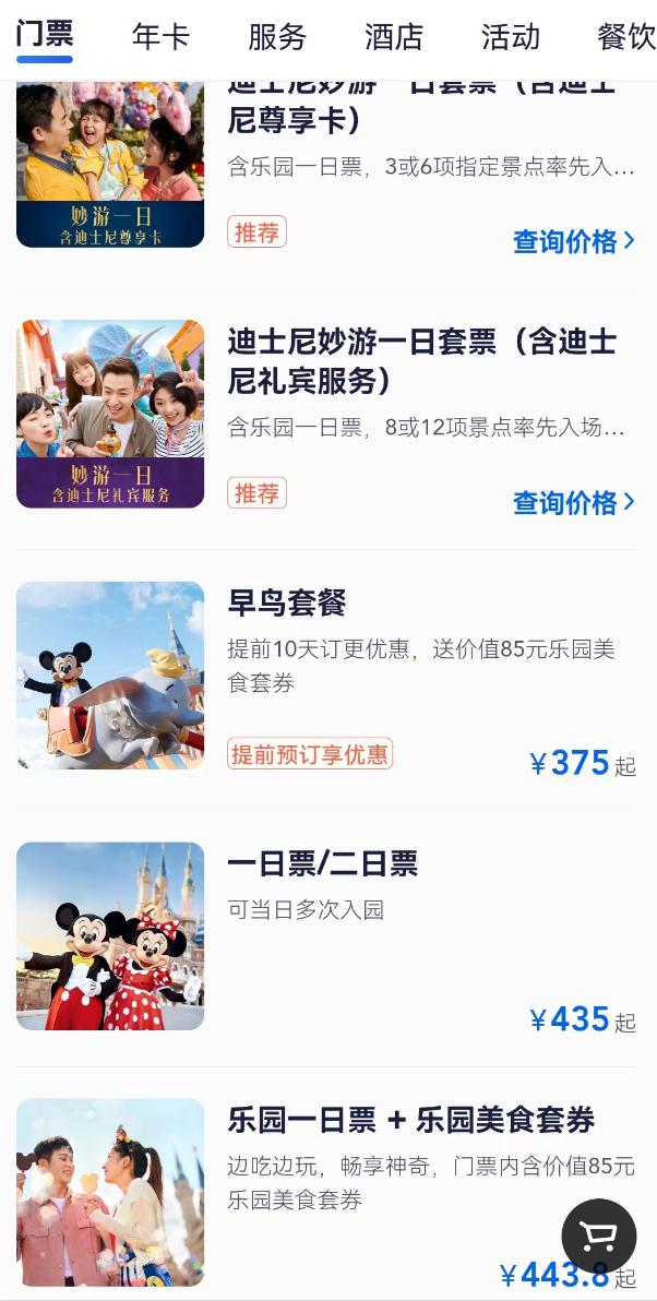此外,上海迪士尼度假區(qū)APP中,除了出售門票之外,還包括酒店、餐券訂購等內(nèi)容。此外,樂園美食券、一日套票、早年套餐、二日票、早享卡、尊享卡等,價格也在百元到千元不等。