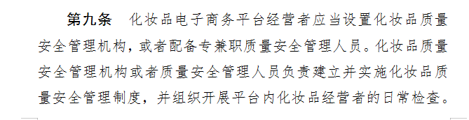 值得一提的是,《辦法》還指出,“化妝品電子商務(wù)平臺經(jīng)營者應(yīng)當(dāng)設(shè)置化妝品質(zhì)量安全管理機(jī)構(gòu),或者配備專兼職質(zhì)量安全管理人員;瘖y品質(zhì)量安全管理機(jī)構(gòu)或者質(zhì)量安全管理人員負(fù)責(zé)建立并實(shí)施化妝品質(zhì)量安全管理制度,并組織開展平臺內(nèi)化妝品經(jīng)營者的日常檢查。”