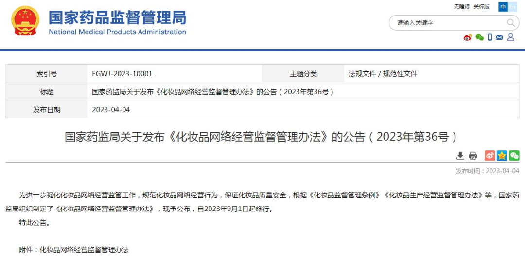 4月4日,國家藥監(jiān)局發(fā)布了《化妝品網(wǎng)絡(luò)經(jīng)營監(jiān)督管理辦法》(下稱《辦法》),并定于今年9月1日起施行。多位資深行業(yè)人士均告訴青眼,這是我國首部專門針對化妝品網(wǎng)絡(luò)經(jīng)營而設(shè)立的法規(guī),頗具歷史意義。