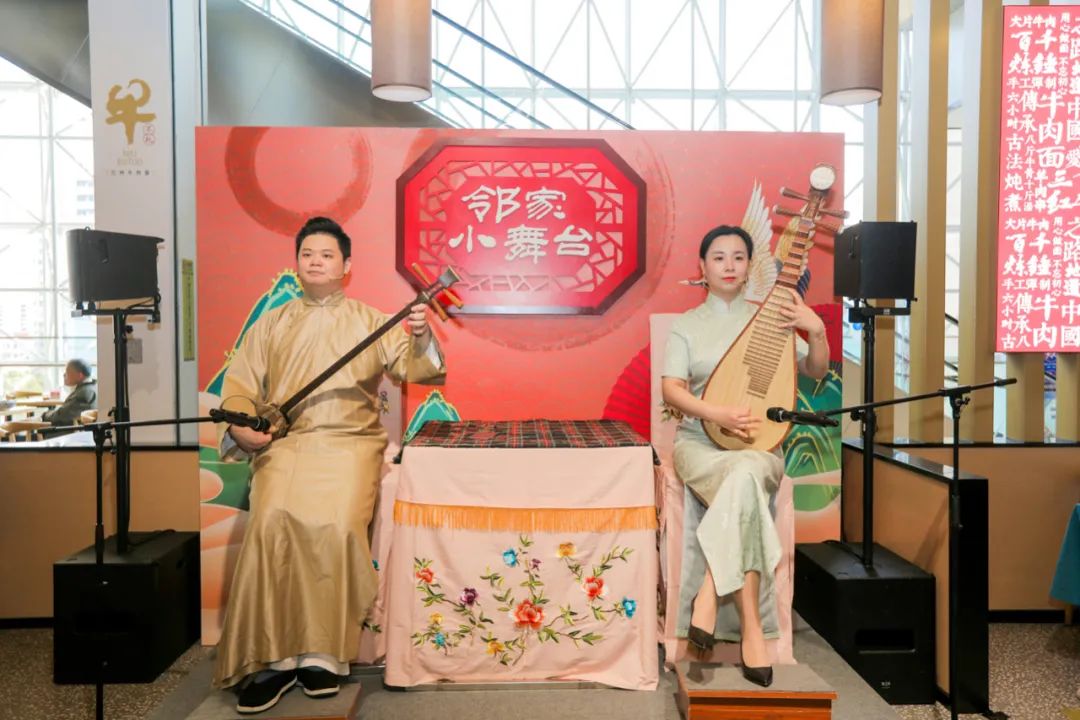 “鄰家小舞臺”位于百聯(lián)曲陽四樓“牛不托蘭州牛肉面”面館內(nèi),并于4月1日下午開啟節(jié)目首秀。此次首演邀請到來自上海評彈團(tuán)青年演員中的優(yōu)秀代表表演傳統(tǒng)曲藝項目目——評彈。
