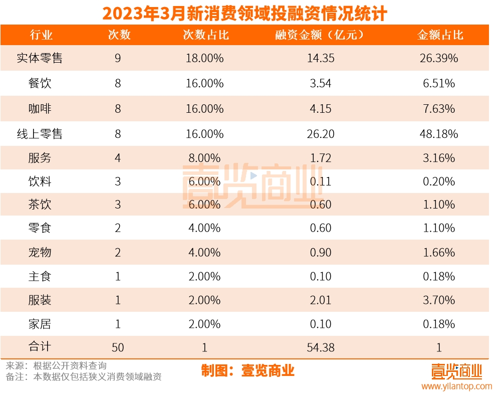 從賽道來看,3月份的融資主要分布在零售、餐飲和咖啡賽道。尤其是零售和餐飲賽道,仍然延續(xù)了今年年初的繁榮,3月份實體零售一共發(fā)生9起,線上零售一共發(fā)生8起,餐飲賽道融資8起。