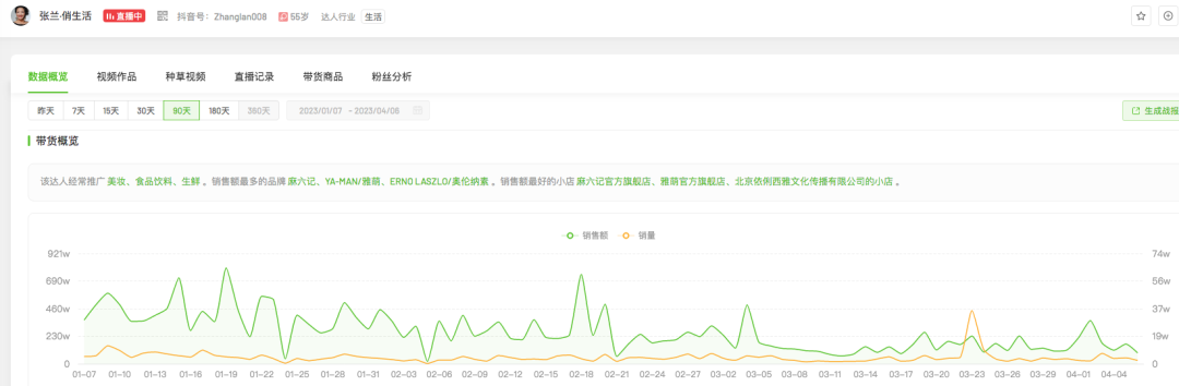 看起來,場(chǎng)均直播銷量變化不大,仍然在750萬到1000萬,但其實(shí),如果在飛瓜數(shù)據(jù)上拉開連續(xù)90天的直播業(yè)績,可以很明顯的看到從1月份到3月份的下滑趨勢(shì)。