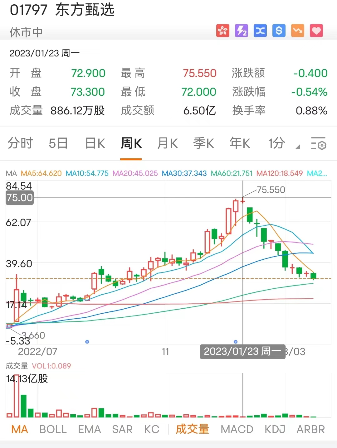 其一,從今年1月份開始,東方甄選的股價(jià)達(dá)到75元以后,開始下跌,證明資本市場(chǎng)在看衰,機(jī)構(gòu)在撤退,現(xiàn)在股價(jià)為30元,兩個(gè)多月,市值腰斬。