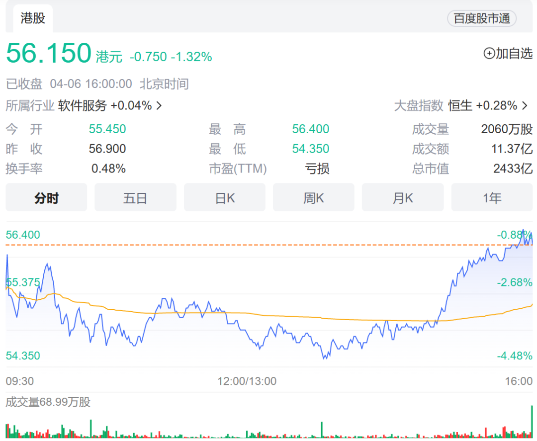 財報公布后,帶來了積極的市場反響,財報發(fā)布當天,股價增長明顯,截至發(fā)稿前,快手股價報56.150港元/股,總市值2433億港元。