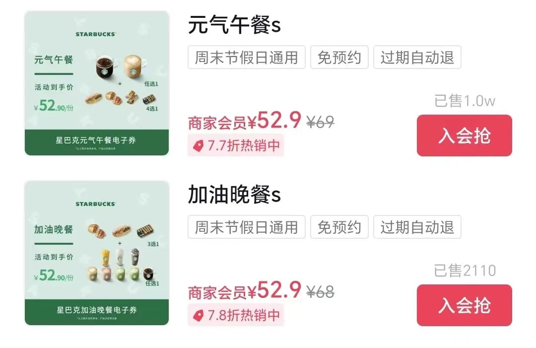 美團(tuán)對應(yīng)的消費(fèi)場景下,大部分消費(fèi)者會先產(chǎn)生對星巴克的消費(fèi)需求,而后打開美團(tuán)尋找優(yōu)惠。這部分用戶大概率原本就是對咖啡有需求的人,平臺滿足的是他們降低成本的訴求,因而更適合以大杯咖啡為重點(diǎn)的套餐。