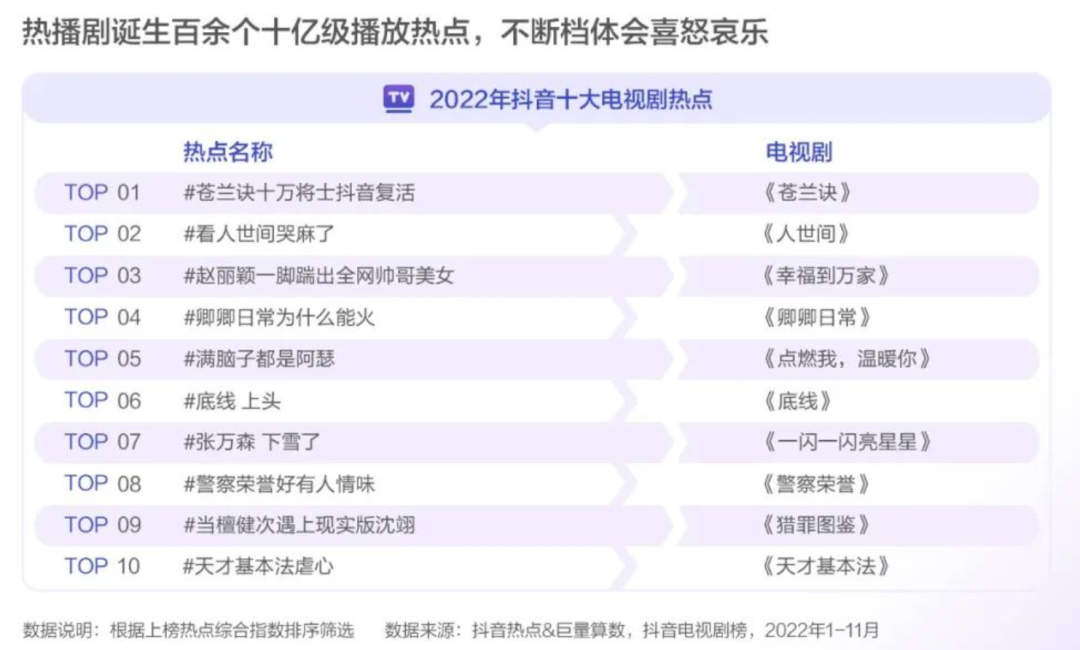 長(zhǎng)視頻平臺(tái)的熱播劇集,在抖音等短視頻平臺(tái)同樣也是“頂流”。2022年播放量破十億甚至達(dá)到百億的抖音十大熱播劇熱點(diǎn),包括“十萬(wàn)將士抖音復(fù)活”對(duì)應(yīng)的《蒼蘭訣》、“看人世間哭麻了”對(duì)應(yīng)的《人間世》、“張萬(wàn)森小雪了”對(duì)應(yīng)的《一閃一閃亮晶晶》等,幾乎也都登上了2022貓眼年度劇集Top10劇榜——可見(jiàn),雙方不是取而代之的關(guān)系,而是添油加火,互相引爆。