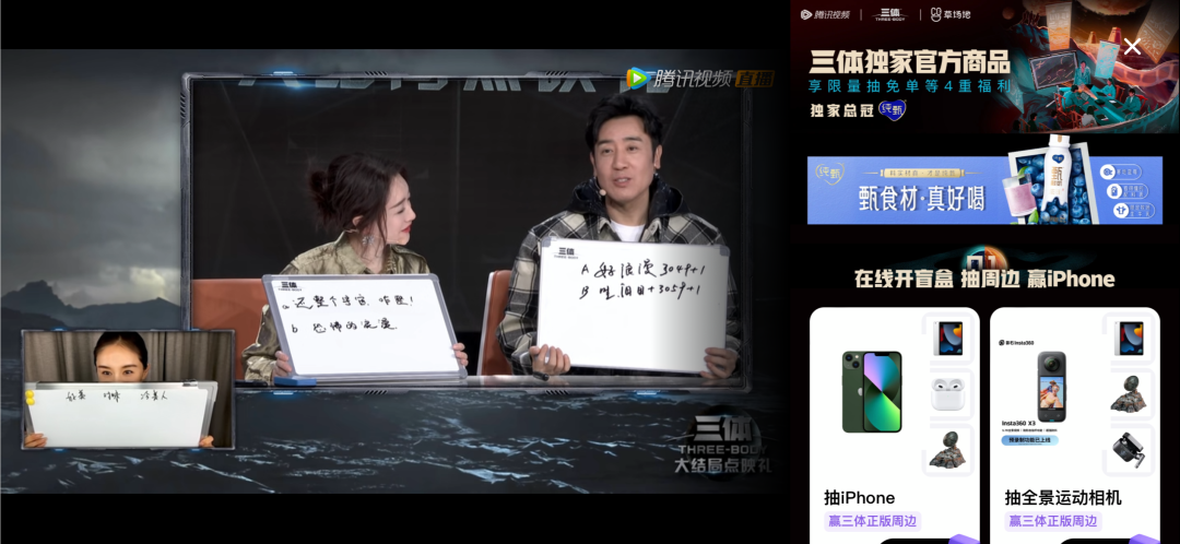 《三體》的大結(jié)局點(diǎn)映禮直播,也嘗試了騰訊視頻和微信視頻號(hào)的聯(lián)合雙端直播。在