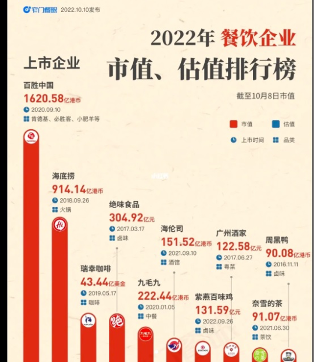 這一點,可以從餐飲行業(yè)上市公司和準上市公司的市值分布大致得到印證。