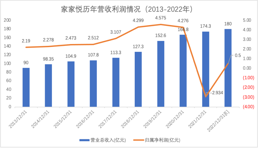 值得注意的是,家家悅在2021年首次出現(xiàn)大額虧損,歸母凈利潤(rùn)跌到-2.93億元。2022年勉強(qiáng)扭虧為盈,預(yù)計(jì)歸母凈利潤(rùn)達(dá)到0.5億元。