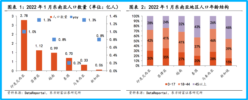 對比全球人口平均1.0%的年增長率,該地區(qū)人口保持較高增速,菲律賓與馬來西亞人口增速達(dá)1.3%。東方財(cái)富證券研究所認(rèn)為,國內(nèi)消失的人口紅利可在東南亞地區(qū)復(fù)現(xiàn)。